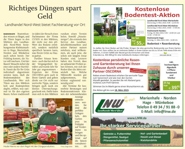 Wir laden Sie - wie jedes Jahr zum Frühling - recht herzlich ein, in unseren Märkten Ihren Boden durch die Fachfirma CUXIN überprüfen zu lassen. Zudem berät die Firma OSCORNA Sie auch gerne zu Hause über die Gartengestaltung.
